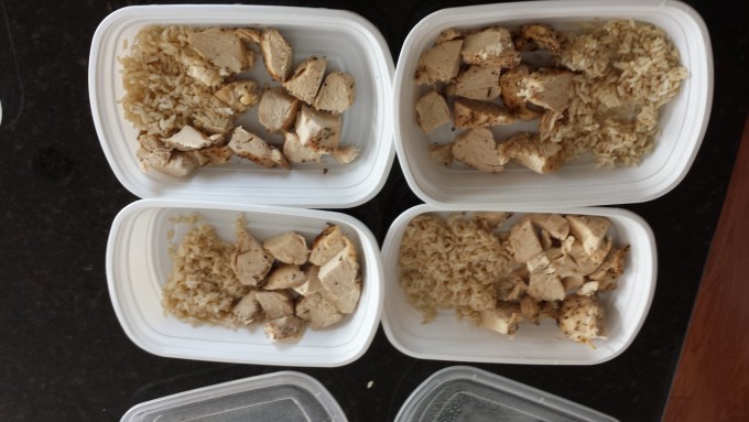 But if you just have chicken and rice in each container, you probably don't have your 65g fat. You get about 2g fat from 100g chicken, so 250-300g chicken = 4-6g fat, and over 4 meals that is 16-24g fat. Add in maybe 1-2g fat per serving of rice and your get up around maybe 35g fat, so still a fair way off your overall fat goal.